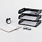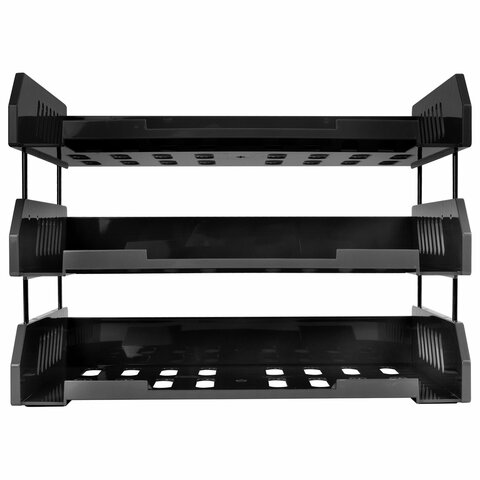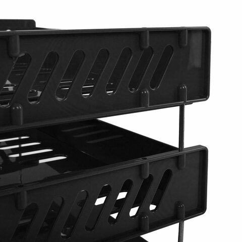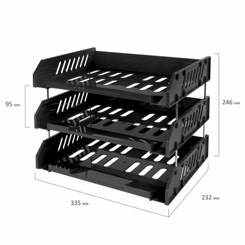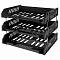 Изготовлены из прочного полистирола. Размер лотков в собранном виде - 335х232х246 мм. Комплект из 3 лотков обладает устойчивой конструкцией, благодаря которой удобен для хранения объемных документов и папок. Выполнены в черном цвете.