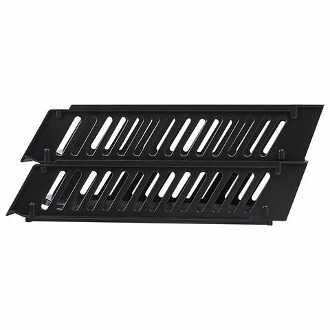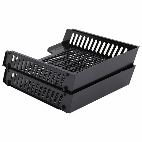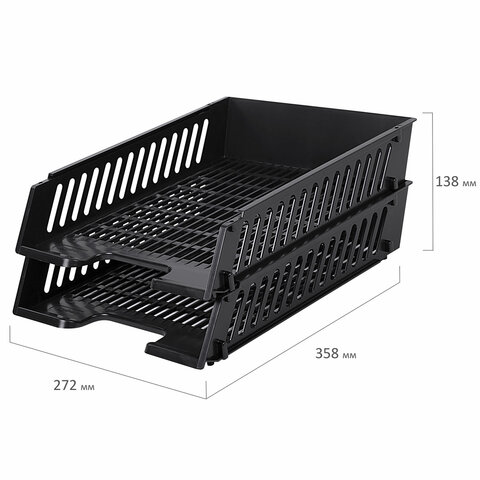 Набор включает 2 лотка, которые устанавливаются друг на друга с помощью пазов, предусмотренных конструкцией изделий, образуя этажерку. Размер лотка - 69х272х358 мм. Высота набора в собранном виде - 138 мм. Изготовлены из пластика черного цвета.