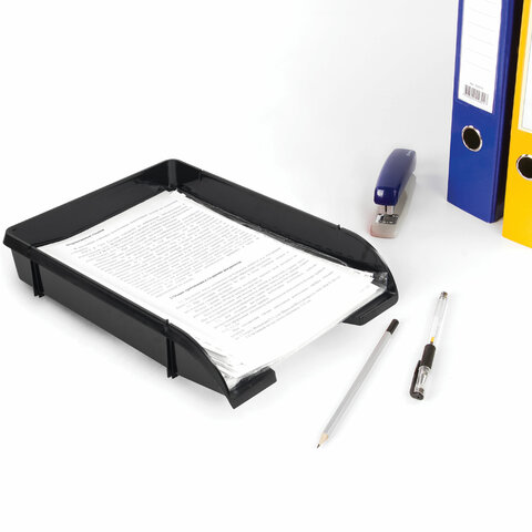Изготовлен из прочного полистирола. Размер (ГхШхВ) - 330х240х62 мм. Обладает устойчивой конструкцией, благодаря которой удобен для хранения объемных документов и папок. Выполнен в черном цвете.