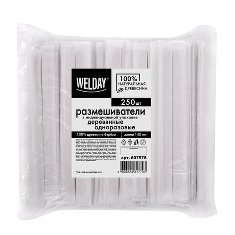 Размешиватель одноразовый деревянный в индивидуальной упаковке 140 мм, КОМПЛЕКТ 250 шт., WELDAY, 607578