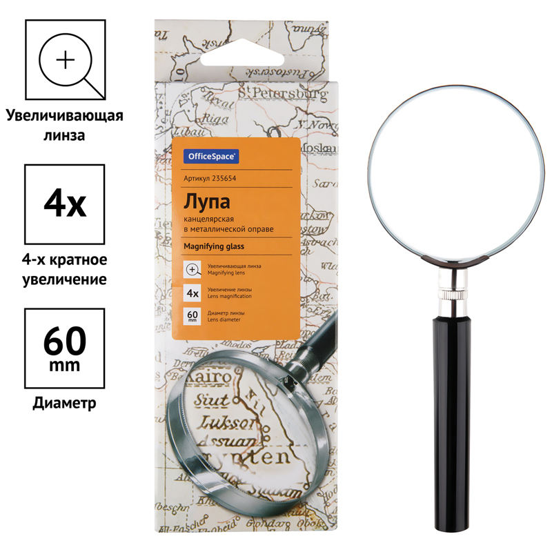 Лупа OfficeSpace, 40мм, 4-х кратное увеличение, в металлической оправе, карт. коробка, европодвес