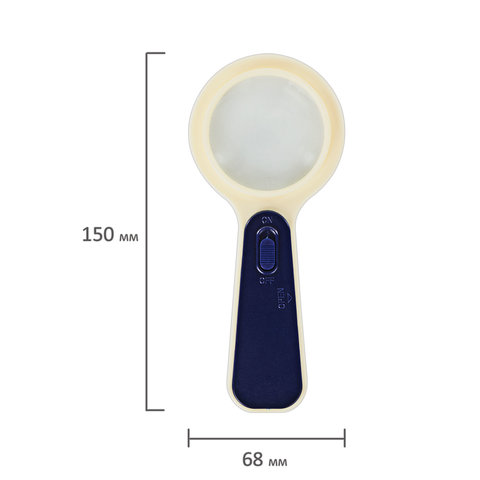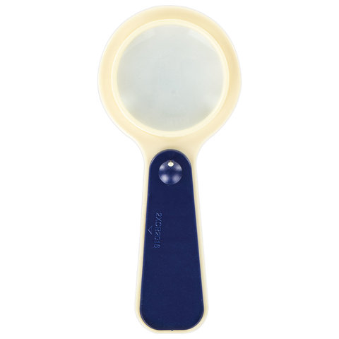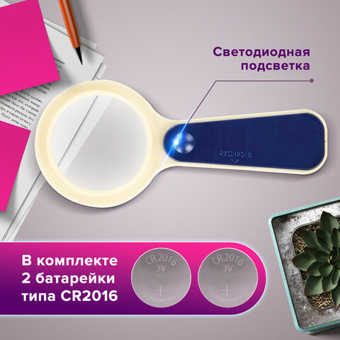 Корпус выполнен из пластика, а линза - из стекла. Асферическая поверхность линзы обеспечивает высокое качество изображения при увеличении мелких объектов и изображений. Диаметр линзы - 50 мм. Производит пятикратное увеличение. Оснащена светодиодной подсветкой. Оправа лупы выступает за края линзы, защищая её от царапин. Снабжена удобной пластиковой ручкой. Питание - 2 батарейки типа CR2016 (в комплекте).