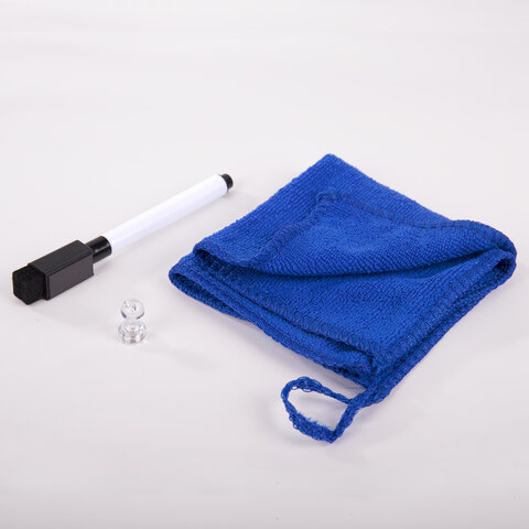 В комплекте: черный маркер для белых досок с магнитом и стирателем в колпачке, салфетка из микрофибры (с «ушком» для подвешивания) и магнит специальной формы, удобной для подвешивания салфетки. Во избежание преждевременного высыхания маркер рекомендуется хранить на холодильнике, колпачком вниз.