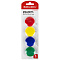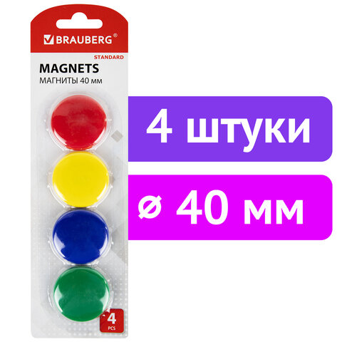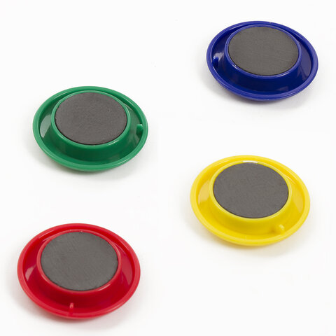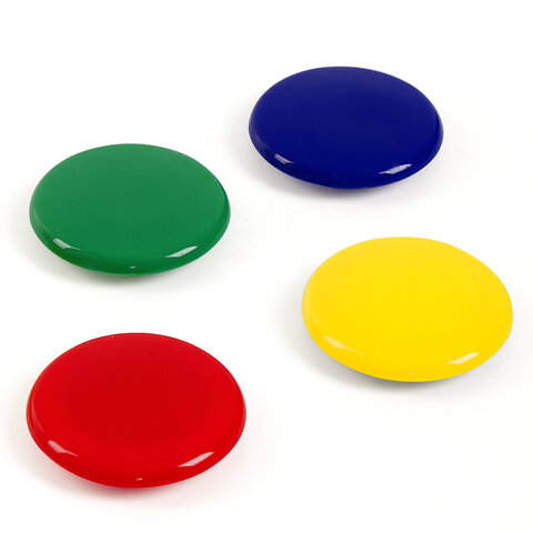 Диаметр магнита составляет 40 мм. 4 штуки в комплекте. Надежно удерживаются на любой железной или стальной поверхности. Магниты круглой формы выполнены из пластика цветов ассорти. Поставляются в удобной блистерной упаковке с европодвесом.