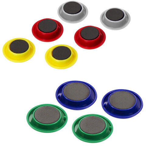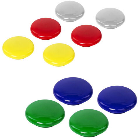 Диаметр четырех магнитов составляет 40 мм и 30 мм у остальных шести магнитов. Всего 10 штук в комплекте. Надежно удерживаются на любой железной или стальной поверхности. Магниты круглой формы выполнены из пластика цветов ассорти. Поставляются в удобной блистерной упаковке с европодвесом.