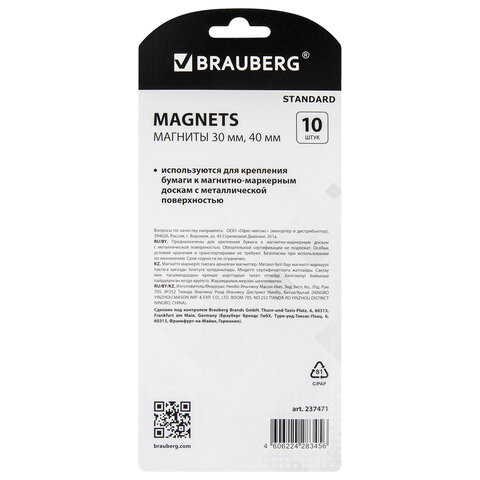 Стильные магниты BRAUBERG "STANDARD" помогут надежно прикрепить листы бумаги к магнитной поверхности досок, витрин и флипчартов.