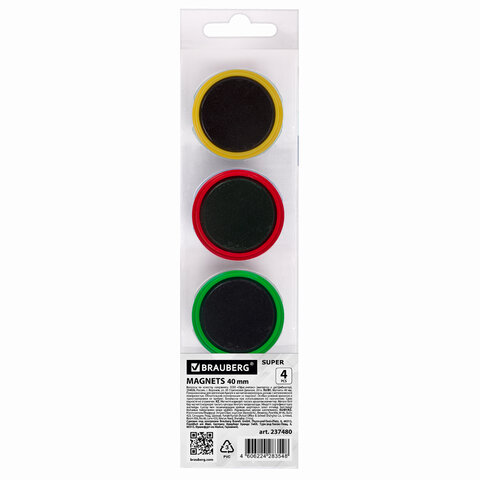 Диаметр магнитов составляет 40 мм. 4 штуки в комплекте. Надежно удерживаются на любой железной или стальной поверхности. Магниты BRAUBERG "SUPER" отличаются повышенной удерживающей магнитной силой. Магниты круглой формы выполнены из пластика цветов ассорти. Поставляются в прозрачном пластиковом боксе с европодвесом.