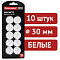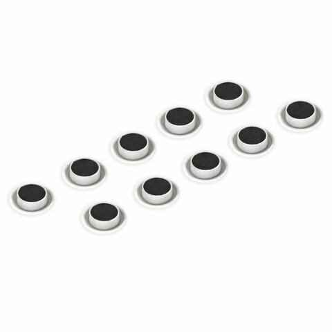 Диаметр магнита составляет 30 мм. 10 штук в комплекте. Надежно удерживаются на любой железной или стальной поверхности. Магниты круглой формы выполнены из пластика белого цвета. Поставляются в удобной блистерной упаковке с европодвесом.