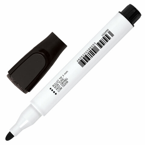 Наконечник круглой формы обеспечивает толщину линии письма 3 мм, что позволяет писать крупным шрифтом, который будет хорошо виден. Основа чернил - спиртовая. Чернила быстро высыхают и не оставляют разводов, легко стираются подушечкой, закрепленной на колпачке, или специальным стирателем для магнитно-маркерных досок.