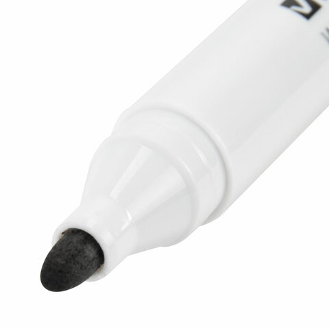 Маркер для доски черного цвета обладает круглым пластиковым корпусом диаметром 15 мм. Наконечник круглой формы обеспечивает толщину линии письма 3 мм, что позволяет писать крупным шрифтом, который будет хорошо виден. Основа чернил - спиртовая. Чернила быстро высыхают и не оставляют разводов, легко стираются сухой губкой. Изделие не перезаправляется. Цвет колпачка с клипом соответствует цвету чернил.