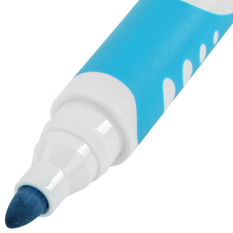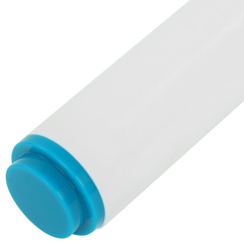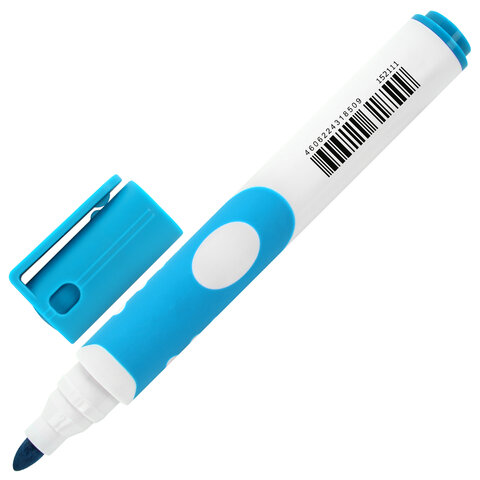 Маркер для доски светло-голубого цвета обладает круглым пластиковым корпусом диаметром 16 мм. Корпус оснащен удобной прорезиненной зоной захвата для более удобного использования. Наконечник круглой формы обеспечивает толщину линии письма 5 мм, что позволяет писать крупным шрифтом, который будет хорошо виден. Основа чернил - спиртовая. Чернила быстро высыхают и не оставляют разводов, легко стираются сухой губкой. Изделие не перезаправляется. Цвет колпачка и прорезиненной вставки соответствует цвету чернил.