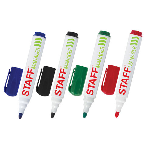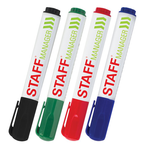 Маркеры стираемые для белой доски НАБОР 4 ЦВЕТА, STAFF "MANAGER" WBM-300, 3 мм, с клипом, 152637