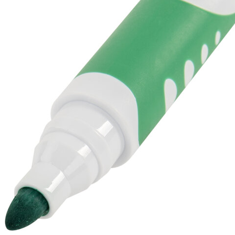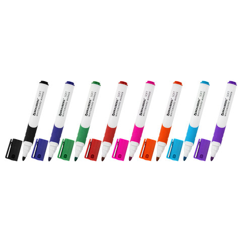 8 цветов в наборе: черный, красный, синий, зеленый, розовый, фиолетовый, оранжевый, светло-голубой. Маркеры обладают круглым пластиковым корпусом диаметром 16 мм и оснащены прорезиненной зоной захвата для более удобного использования. Наконечник круглой формы обеспечивает толщину линии письма 5 мм, что позволяет писать крупным шрифтом, который будет хорошо виден. Основа чернил - спиртовая. Чернила быстро высыхают и не оставляют разводов, легко стираются сухой губкой. Изделие не перезаправляется. Цвет колпачка и прорезиненной вставки соответствует цвету чернил.