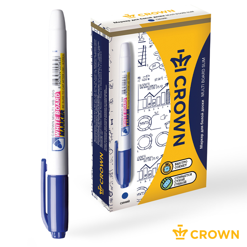 Маркер Crown "Multi Board Slim" предназначен для использования на досках с магнитно-маркерной и на других непористых поверхностях (стекло, фарфор, пленка и пр.) <br/>Тонкий корпус удобно лежит в руке у ребенка. Благодаря особому строению пишущего узла чернила дозированно поступают на поверхность, не вытекают из наконечника и не образуют клякс. Чернила на спиртовой основе высыхают на поверхности доски в течении 1-2 секунд. Маркер до 2 дней не высыхает без колпачка, а при закрытом колпачке в течении одного часа полностью восстанавливает свои свойства! <br/>Прочный фибровый наконечник не западает в корпус и сохраняет форму на протяжении всего срока службы маркера. След от маркера легко удаляется сухой губкой. Пулевидный наконечник позволяет наносить яркие и однородные линии толщиной 2 мм.. Цвет чернил - синий. Упаковка: картонная коробочка по 12 штук.