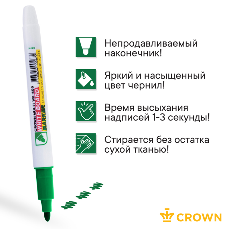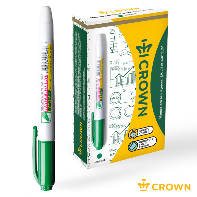 Маркер Crown "Multi Board Slim" предназначен для использования на досках с магнитно-маркерной и на других непористых поверхностях (стекло, фарфор, пленка и пр.) <br/>Тонкий корпус удобно лежит в руке у ребенка. Благодаря особому строению пишущего узла чернила дозированно поступают на поверхность, не вытекают из наконечника и не образуют клякс. Чернила на спиртовой основе высыхают на поверхности доски в течении 1-2 секунд. Маркер до 2 дней не высыхает без колпачка, а при закрытом колпачке в течении одного часа полностью восстанавливает свои свойства! <br/>Прочный фибровый наконечник не западает в корпус и сохраняет форму на протяжении всего срока службы маркера. След от маркера легко удаляется сухой губкой. Пулевидный наконечник позволяет наносить яркие и однородные линии толщиной 2 мм.. Цвет чернил - зеленый. Упаковка: картонная коробочка по 12 штук.