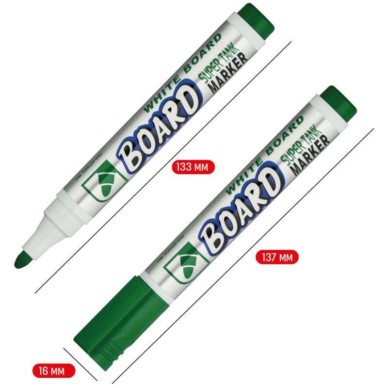 Классический круглый корпус выполнен из высококачественного первичного пластика, обеспечивающего высокую прочность и долгий срок службы маркера. Благодаря особому строению пишущего узла чернила дозированно поступают на поверхность, не вытекают и не образуют клякс. Маркер имеет увеличенный запас чернил (Super tank) и пишет значительно дольше аналогов. Чернила на спиртовой основе, быстро высыхают на поверхности. След от маркера легко удаляется сухой губкой. Маркер до двух дней не высыхает без колпачка, а при закрытом колпачке в течение одного часа полностью восстанавливает свои свойства! Длина линии письма - до 700 метров. Упаковка: картонная коробочка по 12 штук.