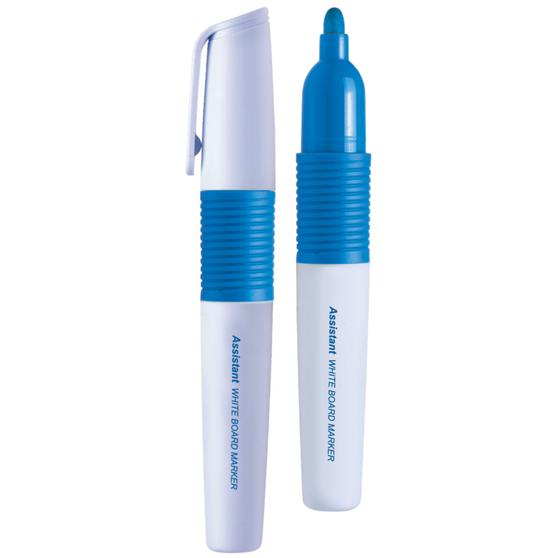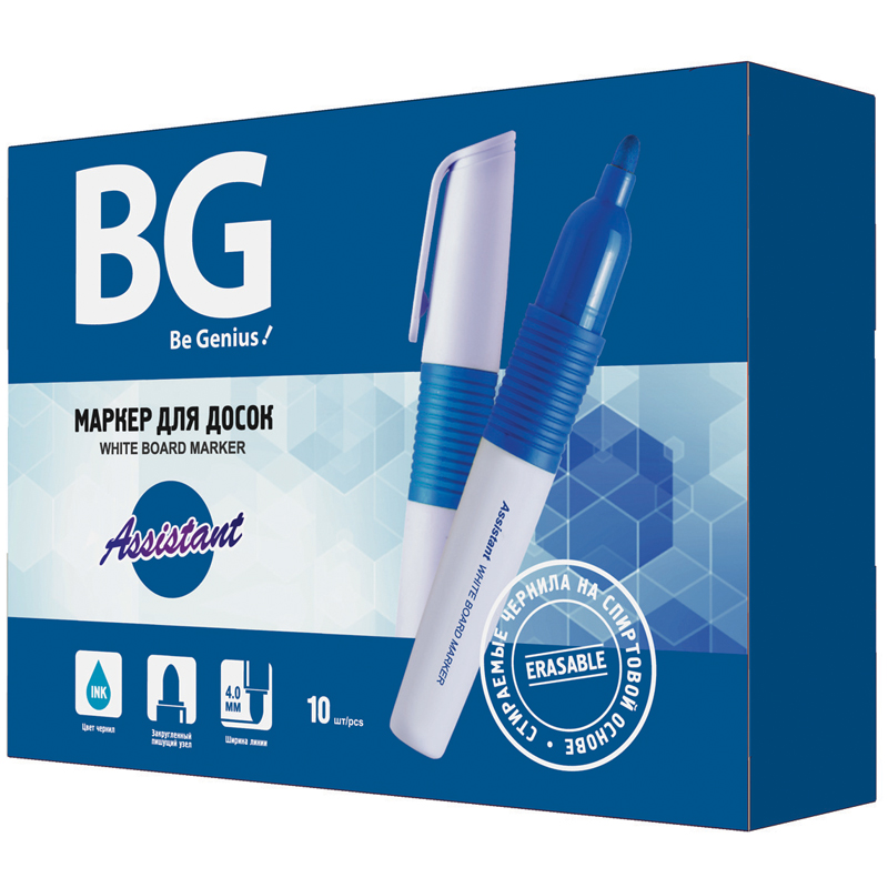 Маркер перманентный BG Assistant с чернилами синего цвета на спиртовой основе предназначен для белых эмалевых досок. Круглый корпус маркера диаметром 10 мм выполнен из пластика. Толщина линии составляет 4 мм. <br/>• цвет чернил: синий;<br/>• толщина линии письма: 4 мм;<br/>• основа чернил: спиртовая.
