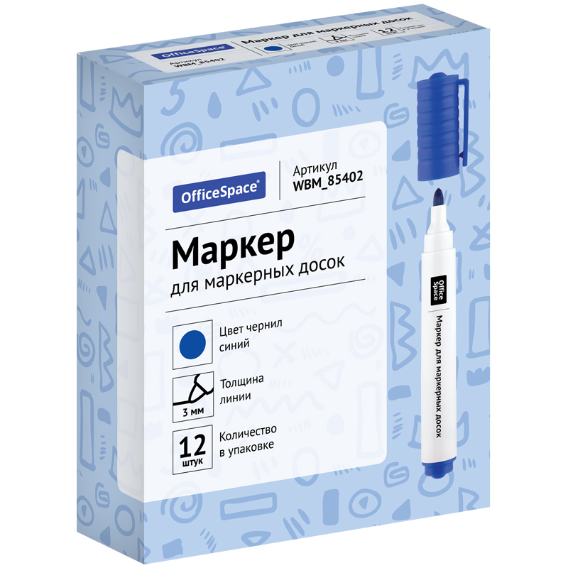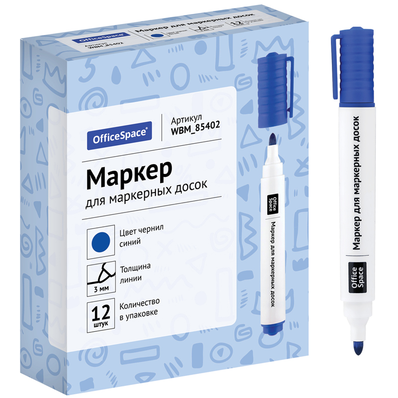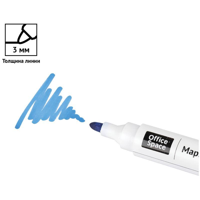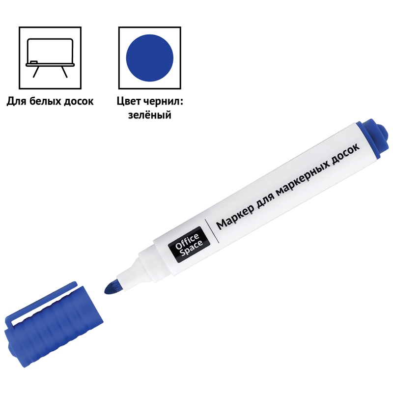 Маркер OfficeSpace предназначен для письма на магнитно-маркерных досках. Толщина линии: 3 мм. Закруглённый пишущий узел. Чернила на спиртовой основе легко стираются сухой губкой для досок. Плотный колпачок с клипом надёжно предотвращает высыхание. Хранить с закрытым колпачком.<br/>• Цвет чернил: синий;<br/>• Толщина линии: 3 мм;<br/>• Форма наконечника: пулевидный;<br/>• Форма корпуса: круглая.