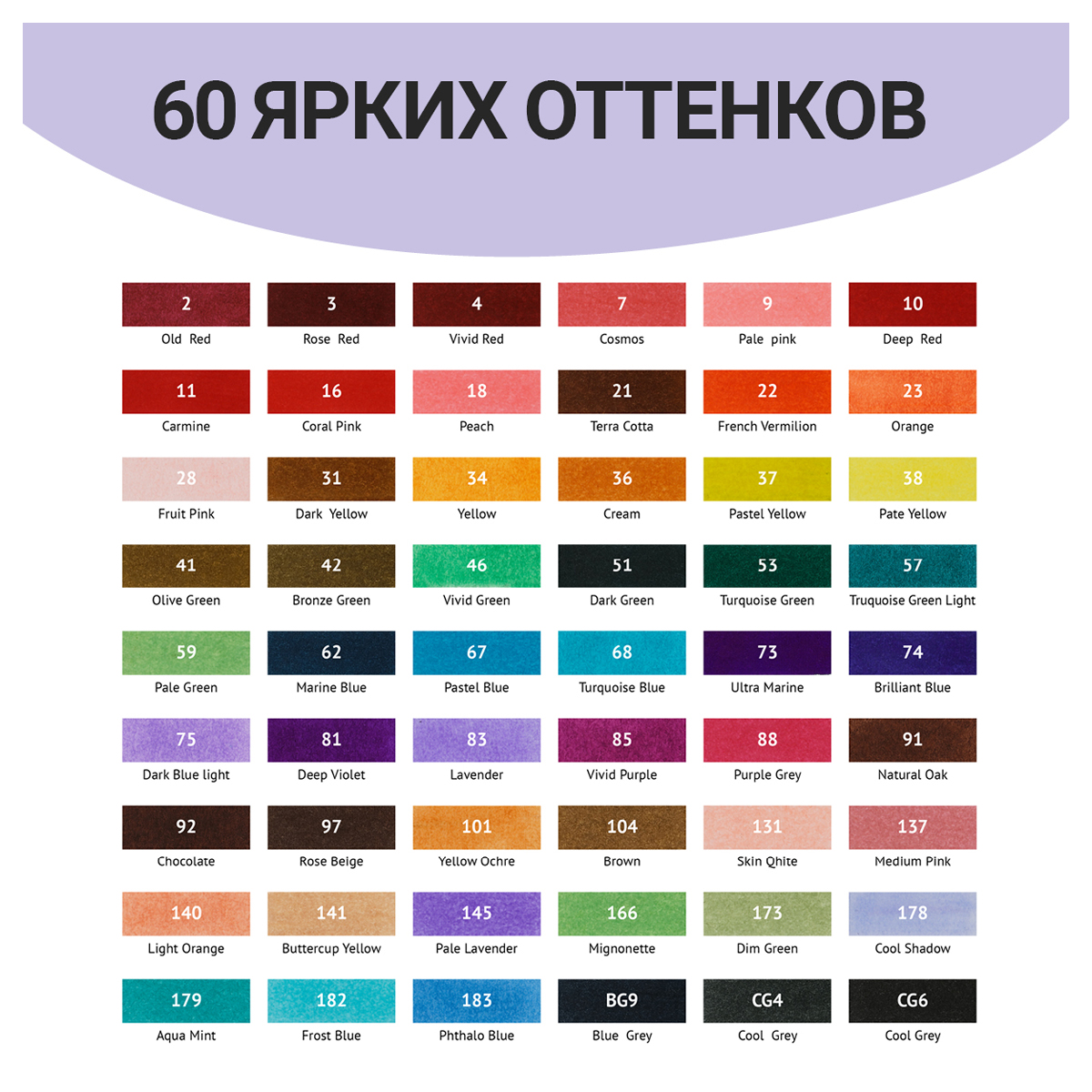 Набор двусторонних маркеров для скетчинга MESHU – идеальный выбор для художников, дизайнеров, иллюстраторов и любителей скетчинга. В наборе 60 основных цветов. Маркеры подходят для создания аниме и манги. Маркеры обладают пулевидным (2мм) и скошенным (6 мм) наконечниками, что позволяет прорабатывать как мелкие детали рисунка, так и закрашивать большие области. Толщина линии может варьироваться от 1 до 6 мм. Длина письма может достигать до 350 метров.