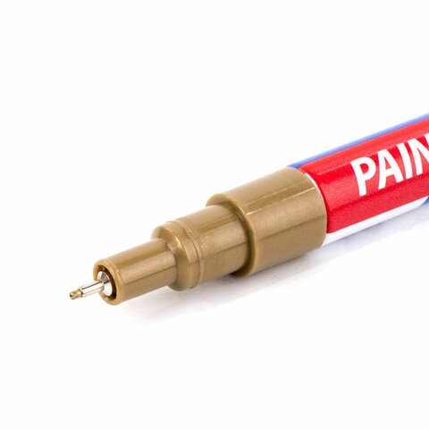 Высококачественные чернила золотого цвета с лаковым эффектом идеально подходят для нанесения долговечной маркировки на любые поверхности. Благодаря усиленной формуле чернил краска ложится ровным слоем, полностью закрашивая поверхность. С помощью игольчатого прочного наконечника, выполненного из полиацетали с шириной линии письма 1 мм, можно легко наносить тонкие линии. Быстросохнущие чернила предотвращают смазывание в процессе маркировки. После высыхания надписи становятся термо- и водостойкими, а также устойчивыми к выцветанию и механическому истиранию. Отлично подходит для маскировки бытовых дефектов, таких как царапины и сколы. Надежный помповый механизм подачи чернил предотвращает вытекание и разбрызгивание в процессе использования, а также преждевременное высыхание. Корпус маркера выполнен из алюминия, внутри находятся 2 металлических шарика для взбалтывания краски. Цвет колпачка соответствует цвету чернил.