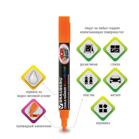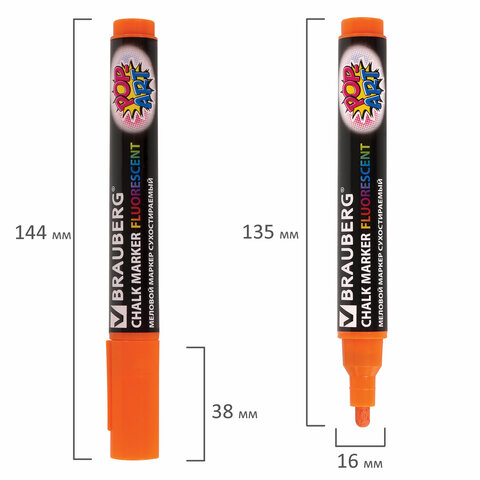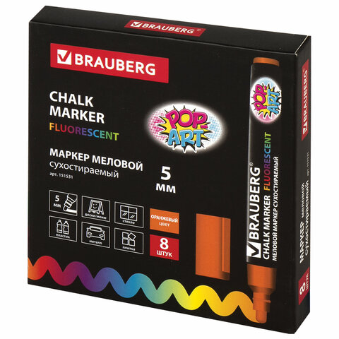 Стираемый меловой маркер BRAUBERG "POP-ART" - оригинальный инструмент для оформления различных зон помещений. Идеален для использования на школьных занятиях и детского творчества.