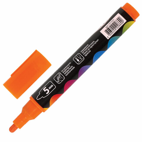 Предназначен для росписи, создания рисунков и надписей на зеркалах, стекле, меловой пленке и прочих гладких и прозрачных невпитывающих поверхностях. Рисунок получается плотный и яркий. Чернила на водно-меловой основе оранжевого цвета без резкого запаха. Толщина линии письма - от 1 мм до 5 мм, зависит от угла наклона мелового маркера. Круглый корпус выполнен из пластика.