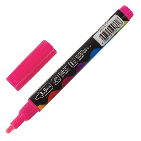 Предназначен для росписи, создания рисунков и надписей на зеркалах, стекле, меловой пленке и прочих гладких и прозрачных невпитывающих поверхностях. Рисунок получается плотный и яркий. Чернила на водно-меловой основе розового цвета без резкого запаха. Толщина линии письма - от 1 мм до 3,5 мм, зависит от угла наклона мелового маркера. Круглый корпус выполнен из пластика.