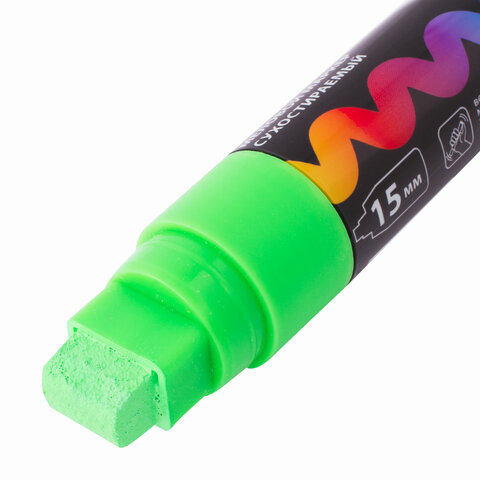 Предназначен для росписи, создания рисунков и надписей на зеркалах, стекле, меловой пленке и прочих гладких и прозрачных невпитывающих поверхностях. Рисунок получается плотный и яркий. Чернила на водно-меловой основе зеленого цвета без резкого запаха. Толщина линии письма - от 2 мм до 15 мм, зависит от угла наклона мелового маркера. Круглый корпус выполнен из пластика.