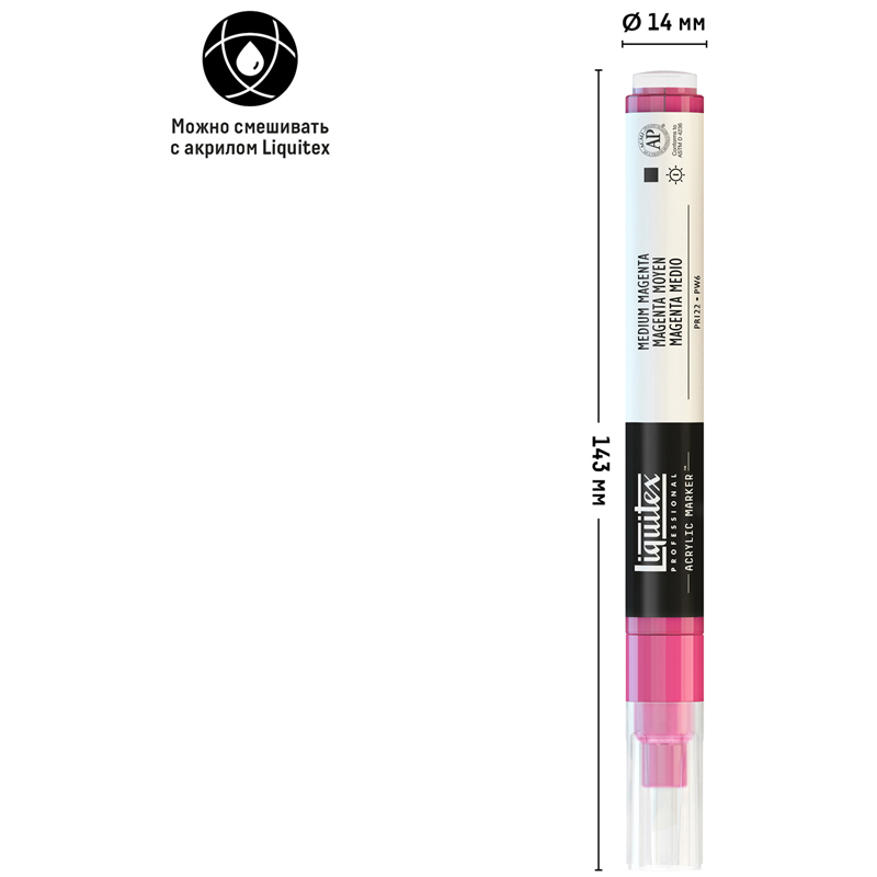 Liquitex "Paint marker Fine" - акриловые маркеры профессионального качества. Корпус маркера оснащён проверенной системой шаровых и насосных клапанов, которые обеспечивают идеальное смешивание и безупречную подачу чернил. Мягкий наконечник размером 2 мм предназначен для прорисовки мелких деталей и создания работ небольших масштабов. Трехгранная форма наконечника позволяет рисовать линии различной толщины. Акриловые чернила на водной основе произведены с использованием высококачественных пигментов, что обеспечивает им высокие укрывные свойства, насыщенный глубокий цвет и светостойкость. Маркеры совместимы с любой линейкой красок Liquitex, могут использоваться для работы в смешанных техниках. Широкий спектр цветовой палитры из 50 цветов раскрывает безграничные возможности для творчества. В качестве финишного покрытия работы рекомендуется использовать лак на основе акрила.