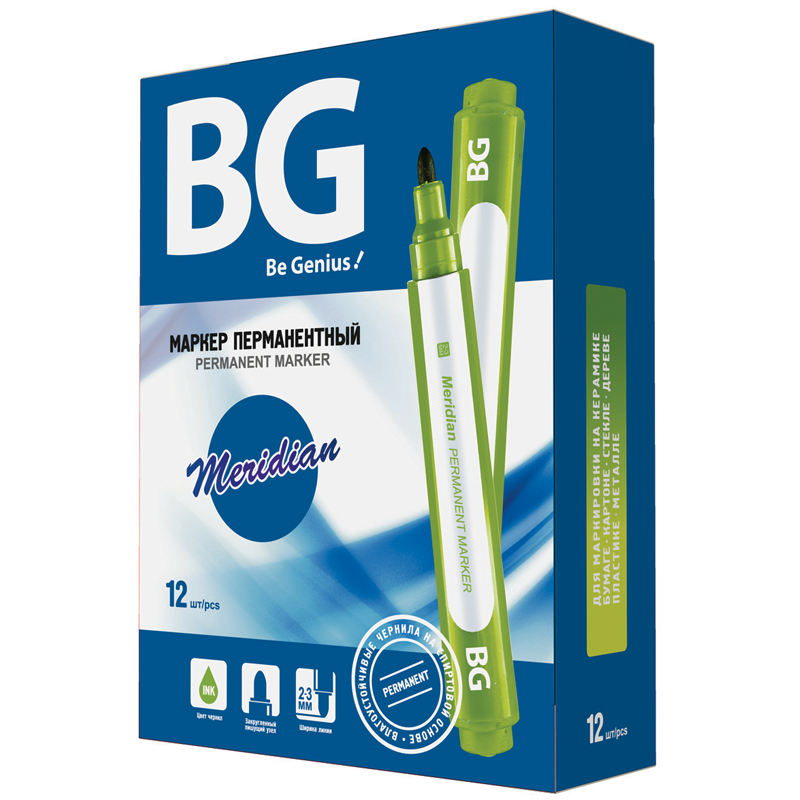 Маркер перманентный BG Meridian с чернилами зелёного цвета на спиртовой основе предназначен для письма на большинстве твёрдых поверхностей, включая картон, бумагу, металл, стекло, дерево и пластик. Круглый корпус маркера диаметром 10 мм выполнен из пластика. Маркер представлен с пулевидным наконечником, толщина линии составляет 2-3 мм. <br/>• цвет чернил: зелёный;<br/>• тип наконечника: пулевидный;<br/>• толщина линии письма: 2-3 мм;<br/>• основа чернил: спиртовая.