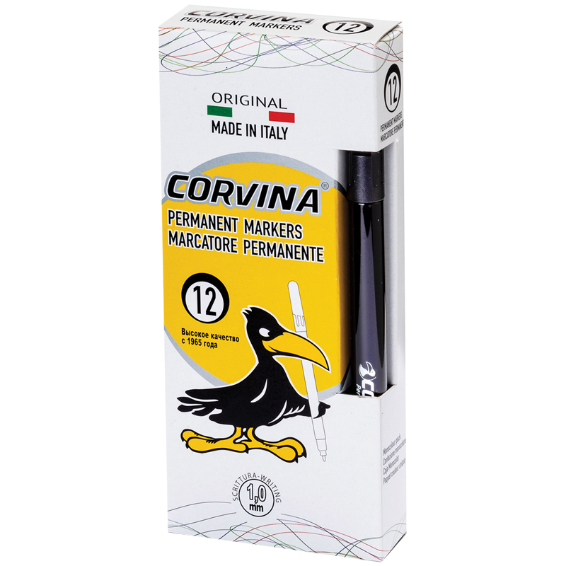 Перманентный маркер Corvina пишет на большинстве поверхностей. Устойчивый к воде, стиранию, атмосферным воздействиям. На спиртовой основе. Пулевидный пишущий узел. Толщина линии 1 мм.