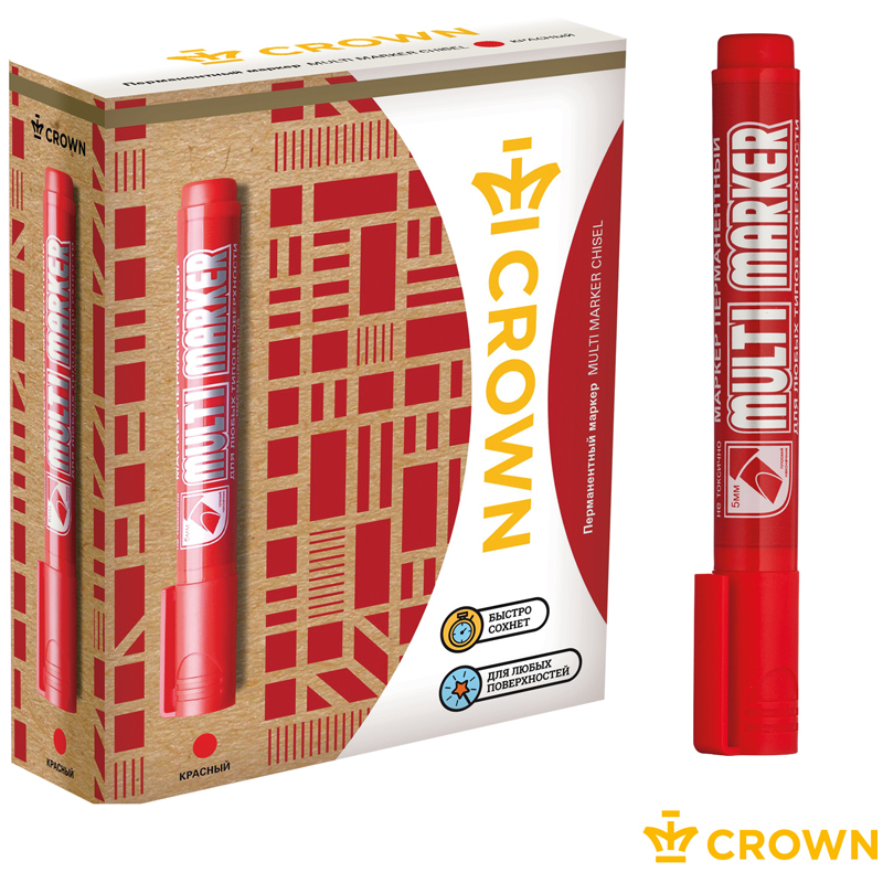 Перманентный маркер Crown "Multi Marker Chisel" - универсальное решение для маркировки на всех типах поверхностей: металл, дерево, резина, бетон/камень/кирпич, стекло, пленка, картон и др.<br/>Длина непрерывной линии в два раза больше стандартных перманентных маркеров и достигает 900 метров. Чернила на спиртовой основе. Цвет чернил - красный, скошенный пишущий узел позволяет варьировать линию письма от -1 - 5 мм. Упаковка: картонная коробка по 12 штук. <br/>Корпус маркера изготовлен из прочного пластика. Чернила устойчивы к климатическим изменения (дождь, туман, солнце), не стираются и не выцветают в течение длительного времени (до 3-х лет в зависимости от эксплуатации промаркированного изделия), оставляют четкую и однородную линию, безопасны для использования и не содержат ксилол и толуол. <br/>Перманентный маркер Crown - качество, проверенное временем.