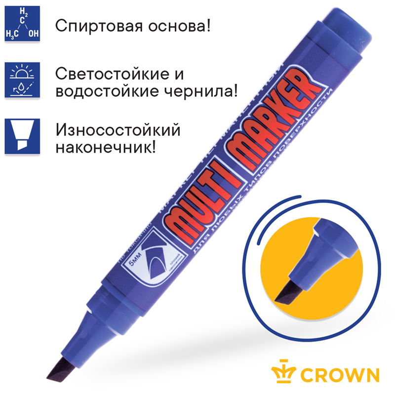 Перманентный маркер Crown "Multi Marker Chisel" - универсальное решение для маркировки на всех типах поверхностей: металл, дерево, резина, бетон/камень/кирпич, стекло, пленка, картон и др.<br/>Длина непрерывной линии в два раза больше стандартных перманентных маркеров и достигает 900 метров. Чернила на спиртовой основе. Цвет чернил - синий, скошенный пишущий узел позволяет варьировать линию письма от -1 - 5 мм. Упаковка: картонная коробка по 12 штук. <br/>Корпус маркера изготовлен из прочного пластика. Чернила устойчивы к климатическим изменения (дождь, туман, солнце), не стираются и не выцветают в течение длительного времени (до 3-х лет в зависимости от эксплуатации промаркированного изделия), оставляют четкую и однородную линию, безопасны для использования и не содержат ксилол и толуол. <br/>Перманентный маркер Crown - качество, проверенное временем.