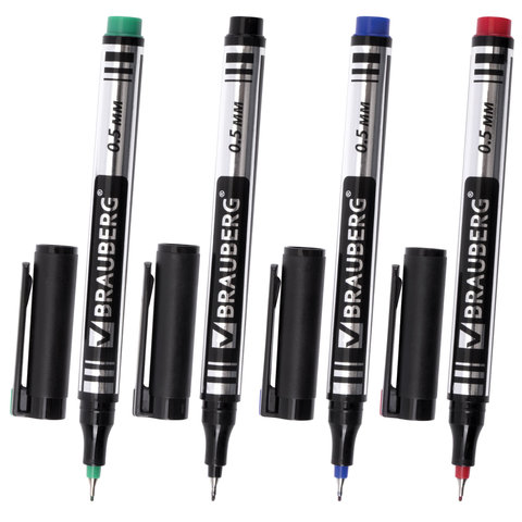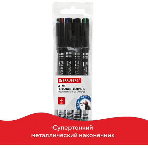4 цвета в наборе: черный, красный, синий, зеленый. Круглая форма корпуса из пластика, диаметр которого 10 мм. Толщина линии письма - 0,5 мм. Особая нестираемая основа перманентного маркера обеспечивает такие качества, как стойкость к воздействию воды, ультрафиолету, низких и высоких температур. Благодаря спиртовой основе чернила быстро сохнут и не размазываются. Износостойкий фетровый наконечник устойчив к повреждениям и обеспечивает экономный расход чернил. Изделие не перезаправляется. Плотно закрывается колпачком, что предотвращает высыхание наконечника и чернил. Цвет колпачка соответствует цвету чернил.