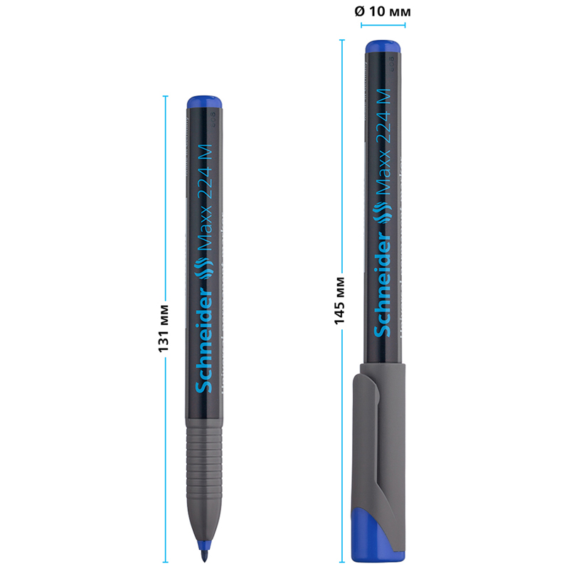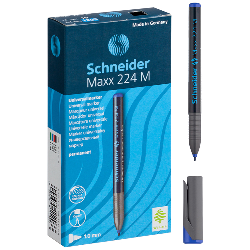 Маркер перманентный Schneider Maxx 224 M с чернилами на спиртовой основе подходит для письма на большинстве твёрдых поверхностей, включая картон, бумагу, металл, стекло, дерево и пластик. Маркер может находиться без колпачка до 3 дней и не высыхает. У изделия с пулевидным наконечником ширина линии письма составляет 1 мм. Маркеры из 10 штук упакованы в картонную коробку.<br/>Надписи быстро высыхают, не выцветают и не размываются. Цвет чернил - синий. Круглый корпус маркера диаметром 10 мм выполнен из пластика. <br/>• цвет чернил: синий;<br/>• тип наконечника: пулевидный;<br/>• основа чернил: спиртовая;<br/>• толщина линии письма: 1 мм.