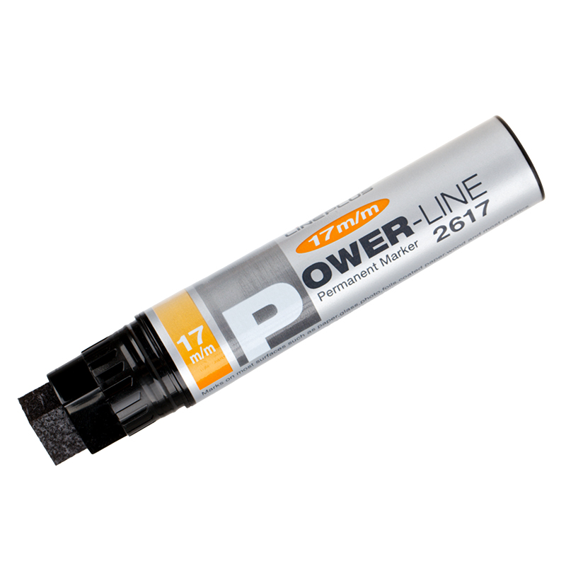 Промышленный перманентный маркер на спиртовой основе предназначен для использования на всех типах производственных поверхностях: металл, масляная поверхность, шероховатая и ржавая поверхность, пластмасса, стекло, керамика и другое. Ударопрочный металлический корпус. Цвет чернил - черный. Скошенный наконечник позволяет наносить линии разной толщины от 4 до 17 мм. Комфортная модель большой емкости Power с широким скошенным наконечником . Насыщенность цвета не ослабевает в процессе использования.