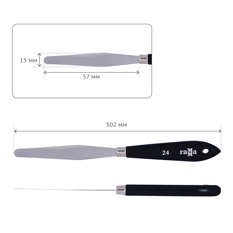 Паяный мастихин из нержавеющей стали с удобной плоской ручкой из натурального бука. Сварное соединение ручки и лезвия дает больший угол наклона мастихина к холсту, снижая вероятность случайного касания и смазывания краски.