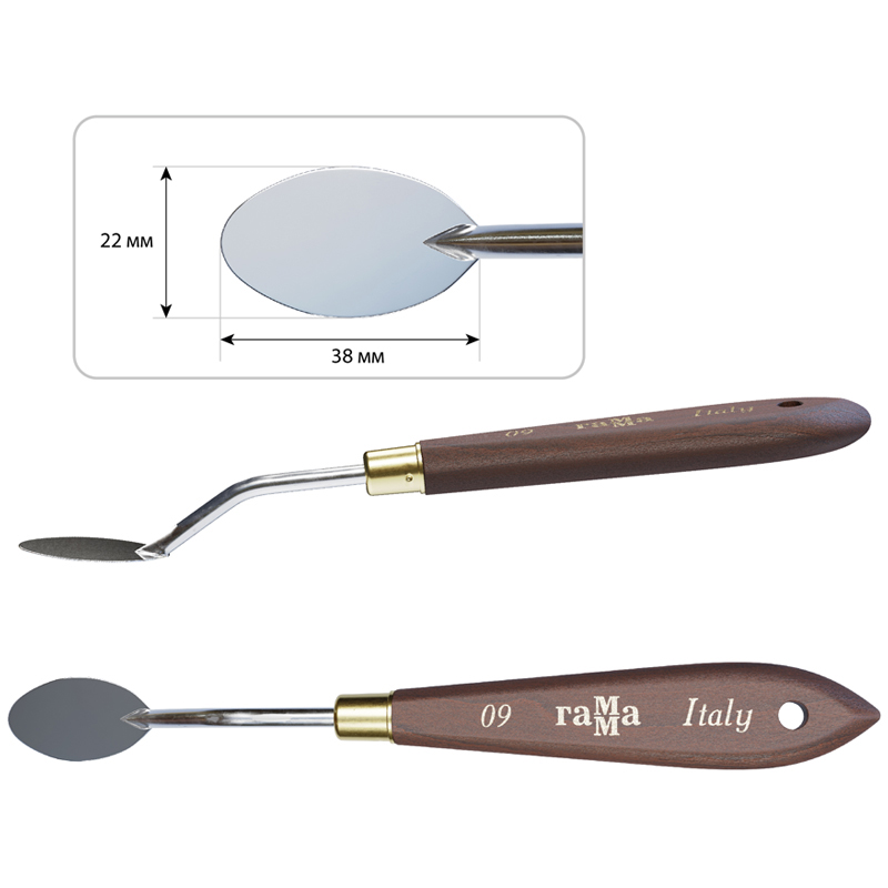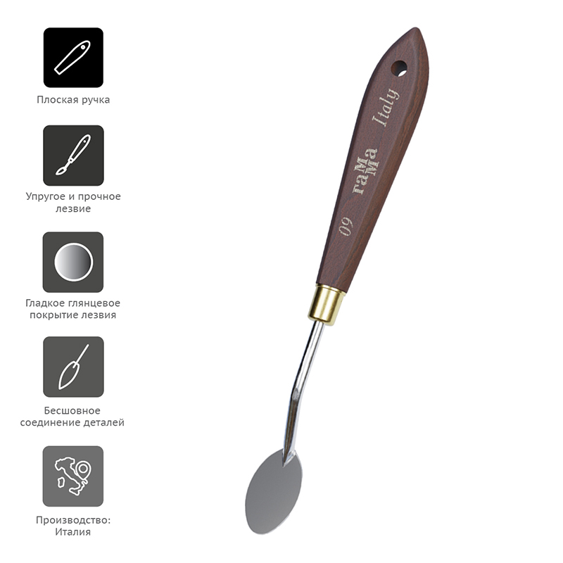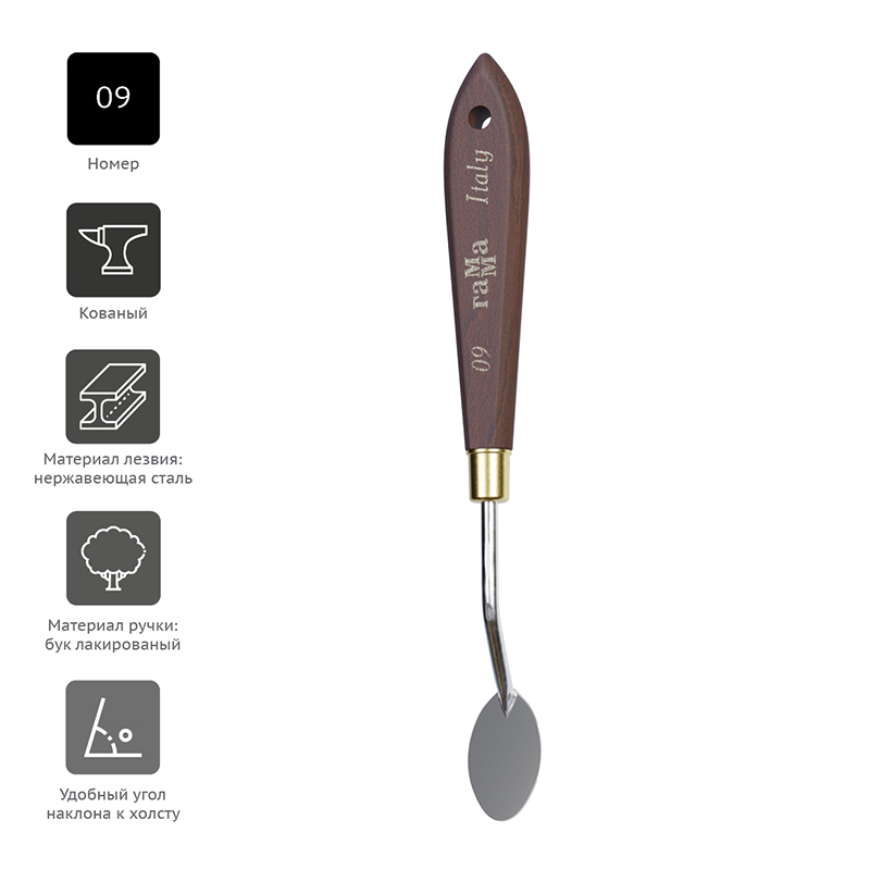 Мастихины серии «Старый Мастер» изготовлены вручную в Италии. Лезвие из нержавеющей стали прочное и упругое. Лезвие имеет специальное глянцевое покрытие для долговечной службы. Эргономичная ручка из натурального бука отполирована вручную и оснащена отверстием для хранения на подвесе. Бесшовная обойма гарантирует надежное соединение лезвия и ручки. Коллекция мастихинов представлена в 12 самых популярных видах лезвий: ромб, капля, «рыбка», овальное, прямоугольные.