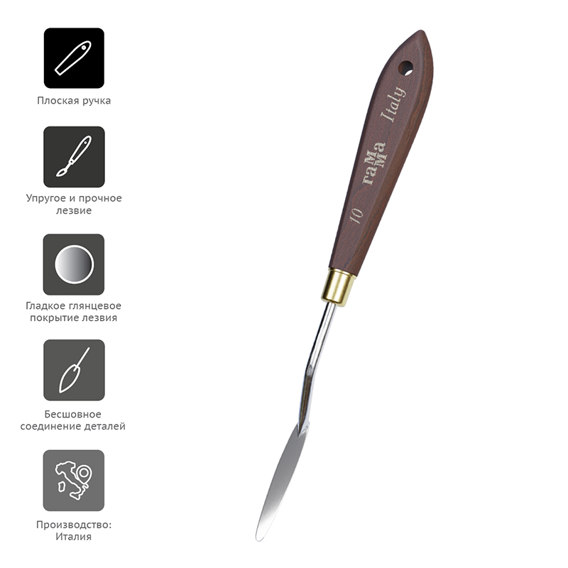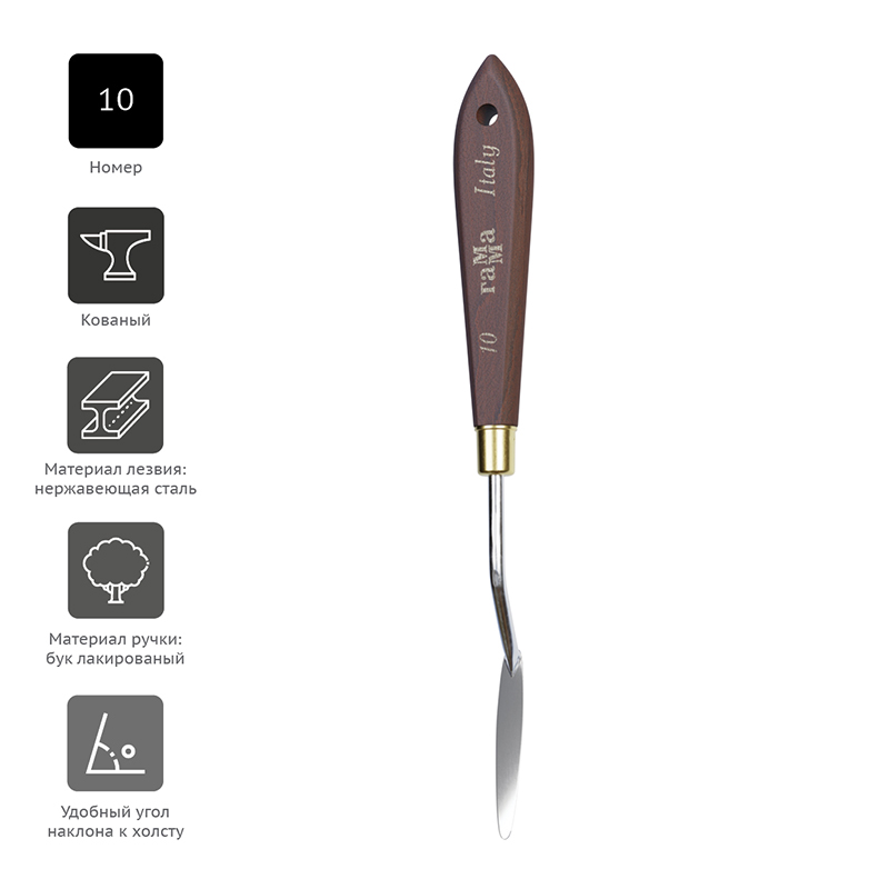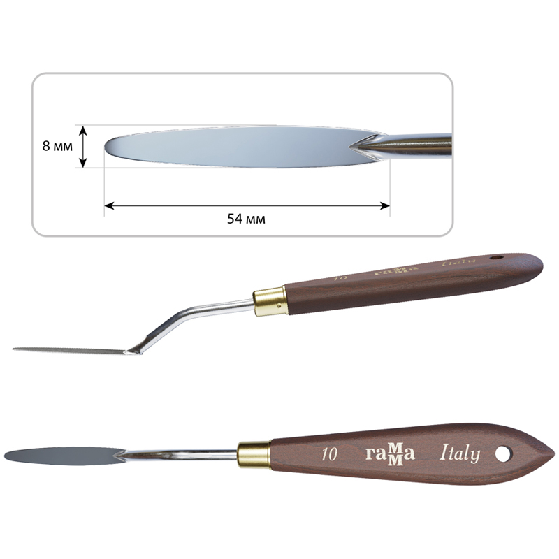 Мастихины серии «Старый Мастер» изготовлены вручную в Италии. Лезвие из нержавеющей стали прочное и упругое. Лезвие имеет специальное глянцевое покрытие для долговечной службы. Эргономичная ручка из натурального бука отполирована вручную и оснащена отверстием для хранения на подвесе. Бесшовная обойма гарантирует надежное соединение лезвия и ручки. Коллекция мастихинов представлена в 12 самых популярных видах лезвий: ромб, капля, «рыбка», овальное, прямоугольные.