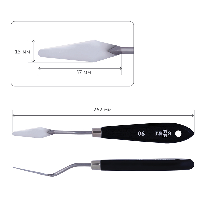 Паяный мастихин из нержавеющей стали с удобной плоской ручкой из натурального бука. Сварное соединение ручки и лезвия дает больший угол наклона мастихина к холсту, снижая вероятность случайного касания и смазывания краски.