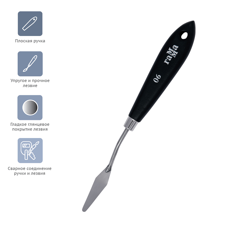 Паяный мастихин из нержавеющей стали с удобной плоской ручкой из натурального бука. Сварное соединение ручки и лезвия дает больший угол наклона мастихина к холсту, снижая вероятность случайного касания и смазывания краски.<br/>Форма лезвия — ромб.<br/>размер рабочей поверхности мастихина-45мм*12мм