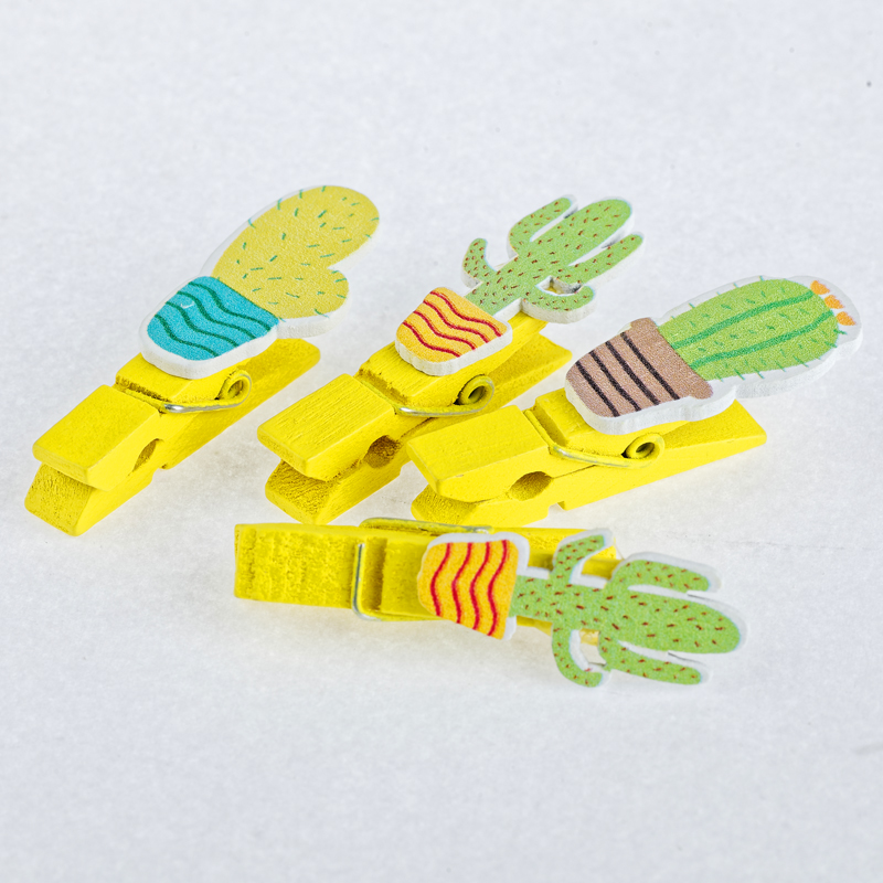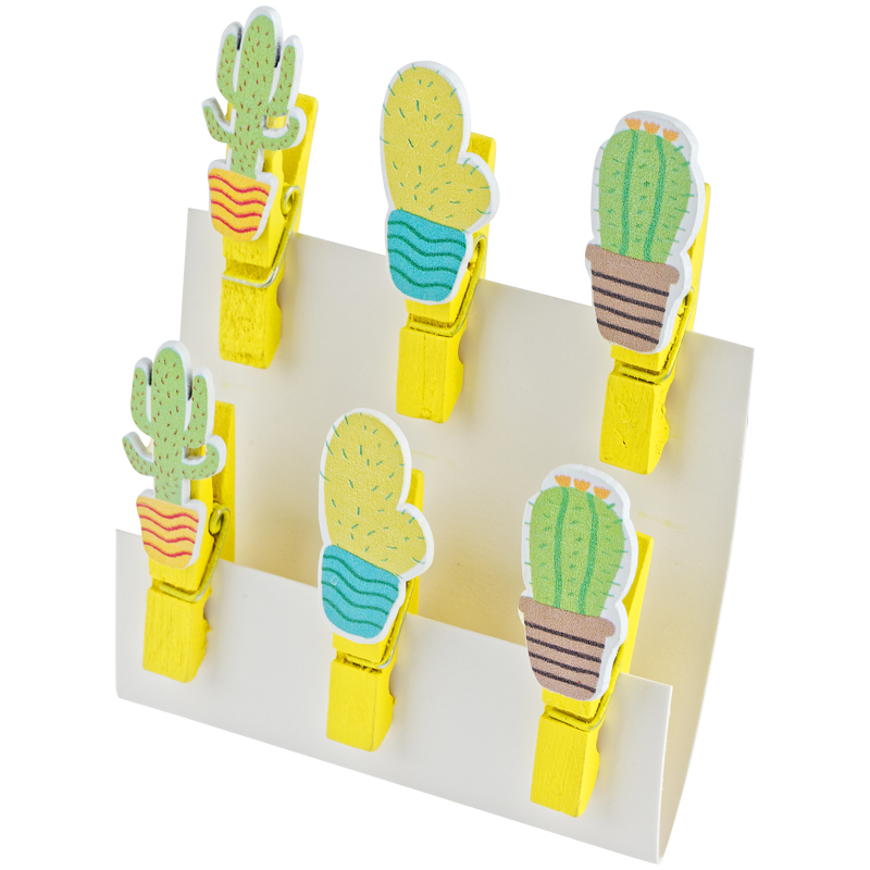 Декоративные прищепки для любого вида украшений (верёвочки, теги, цветочные горшки, открытки,..). В наборе 6 деревянных цветных прищепок с приклеенными фигурками кактусов.
