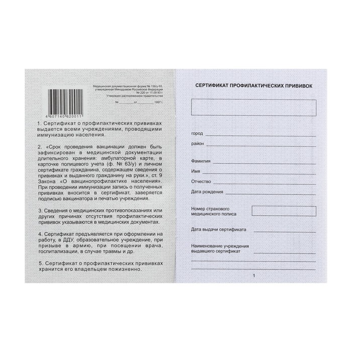 Сертификат о профилактических прививках А6, 12 листов, форма 156/у-93