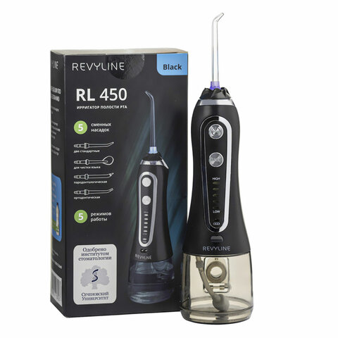 Ирригатор для полости рта REVYLINE RL 450, портативный, емкость резервуара 0,24 л, 5 насадок, черный