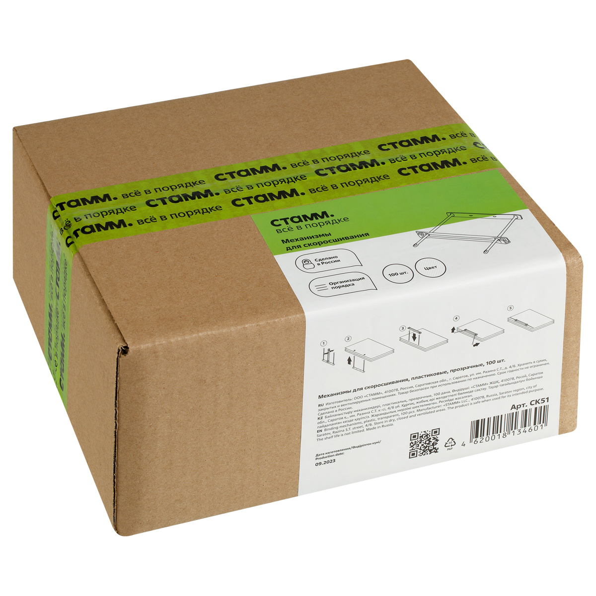 Механизмы для скоросшивания «СТАММ» предназначены для архивирования перфорированной документации. Одно изделие рассчитано на сшивание до 600 листов. На механизмах предусмотрен фиксатор, который позволяет надёжно закрепить документы. Длина ножек изделия составляет 10 см. В наборе 100 штук механизмов. Упаковка – картонная коробка, дополненная изображением пошаговой инструкции по применению изделий. Цвет механизмов – прозрачный. Изготовлены из качественного полипропилена.<br/>• Количество: 100;<br/>• Материал: полипропилен;<br/>• Вместимость: 600 листов;<br/>• Цвет: прозрачный.