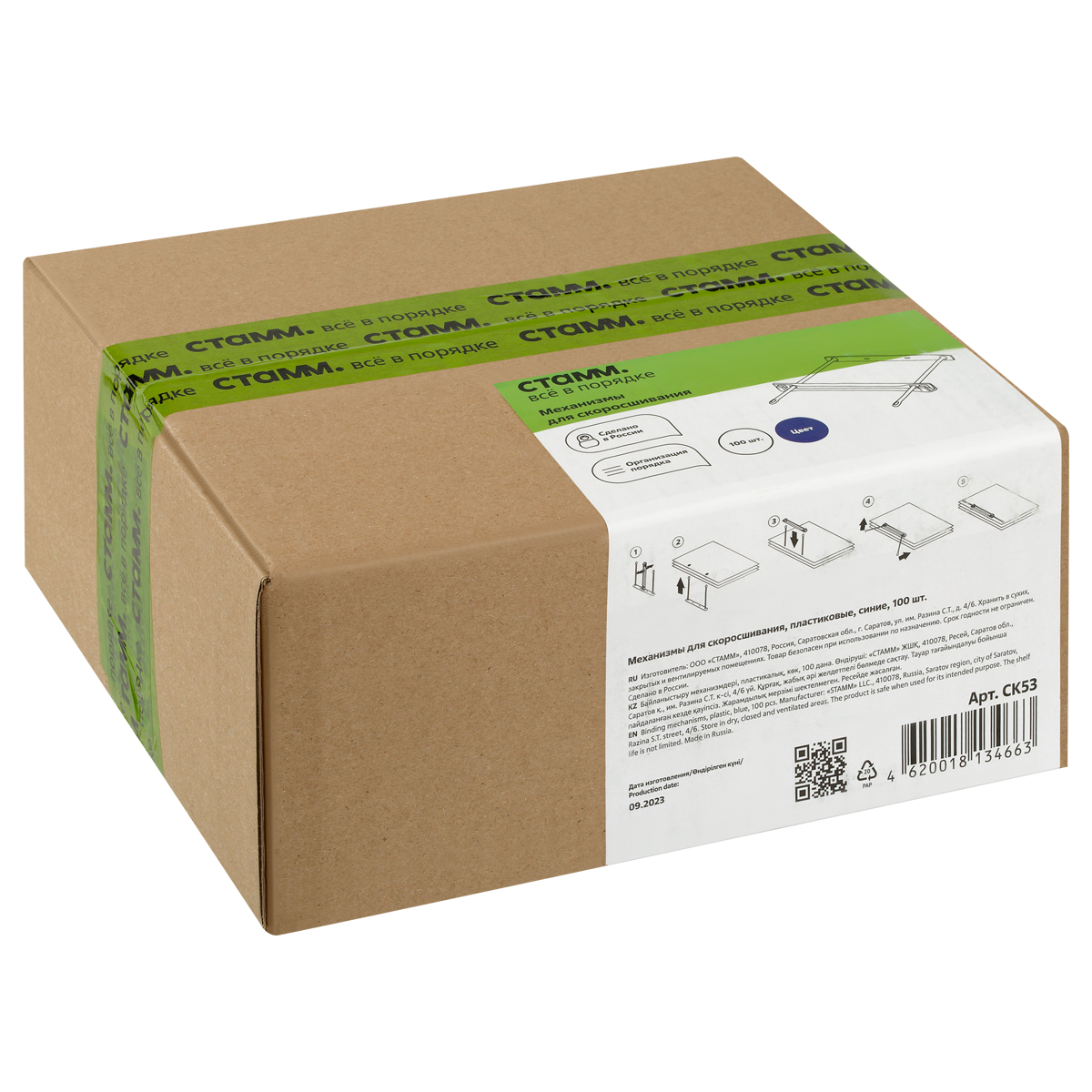 Механизмы для скоросшивания «СТАММ» предназначены для архивирования перфорированной документации. Одно изделие рассчитано на сшивание до 600 листов. На механизмах предусмотрен фиксатор, который позволяет надёжно закрепить документы. Длина ножек изделия составляет 10 см. В наборе 100 штук механизмов. Упаковка – картонная коробка, дополненная изображением пошаговой инструкции по применению изделий. Цвет механизмов – синий. Изготовлены из качественного полипропилена.<br/>• Количество: 100;<br/>• Материал: полипропилен;<br/>• Вместимость: 600 листов;<br/>• Цвет: синий.