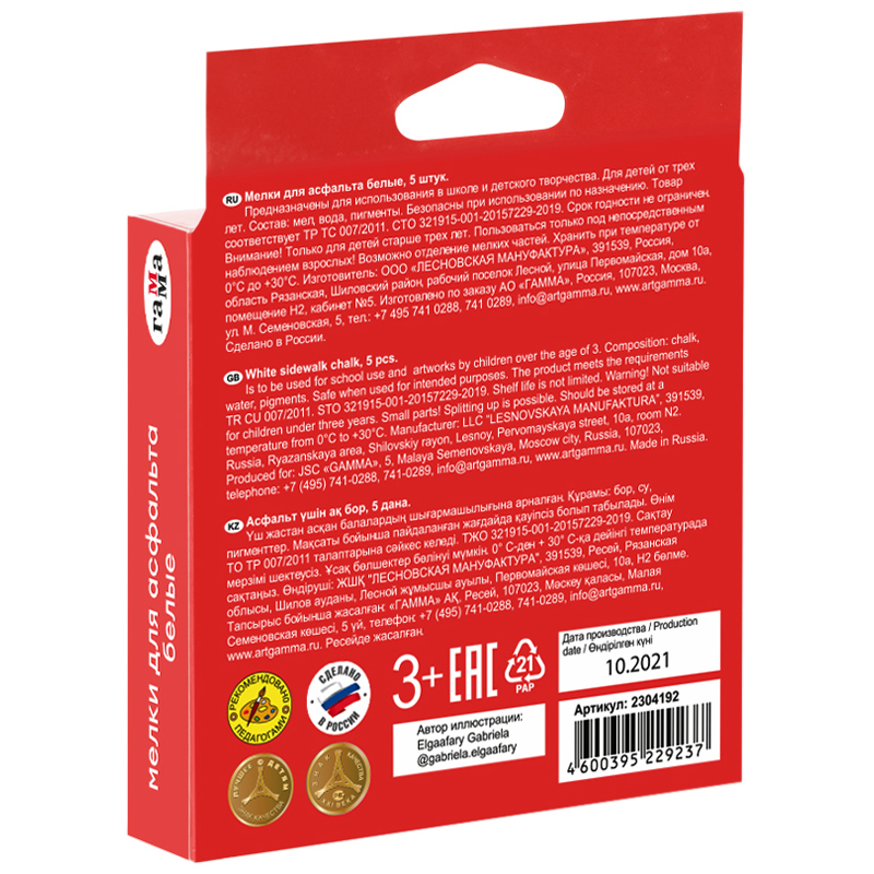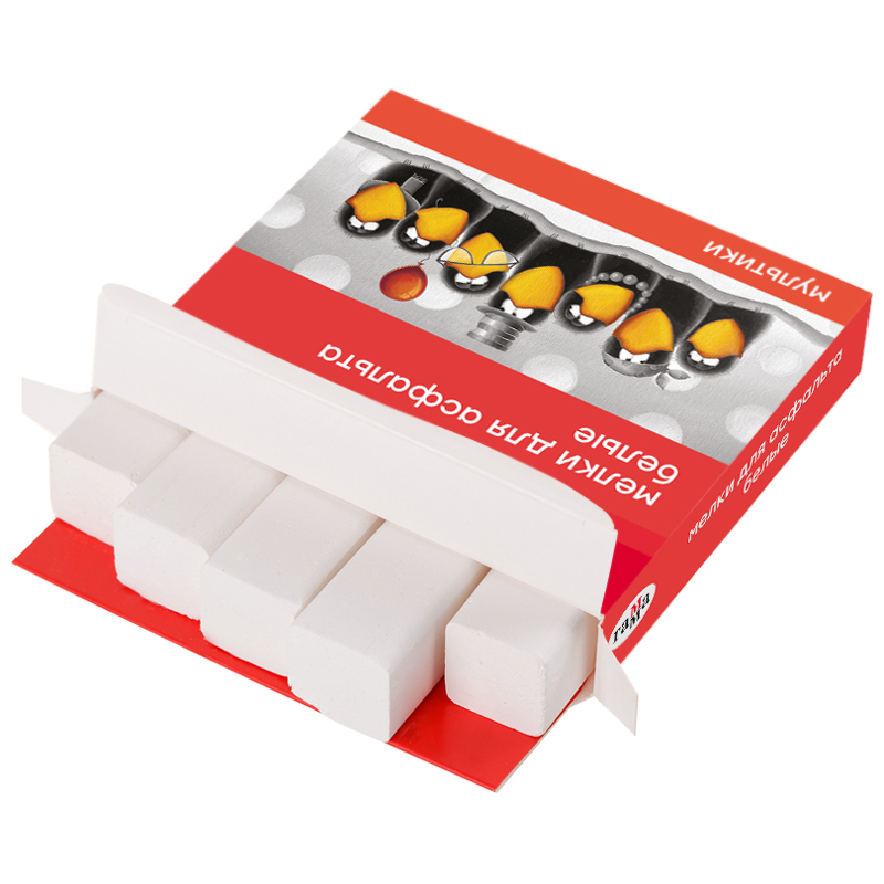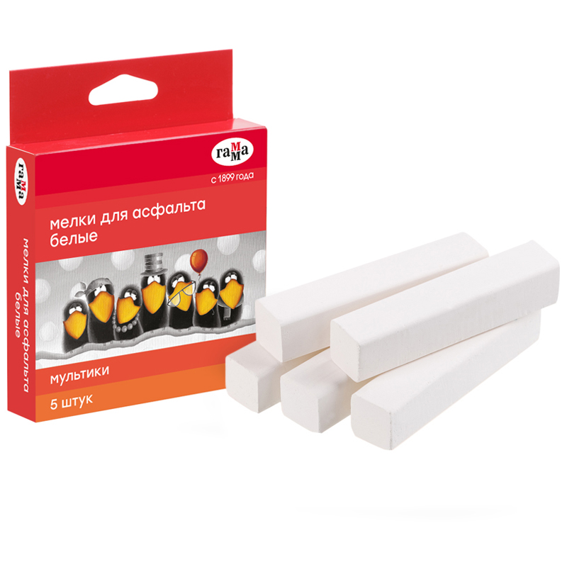 Набор из 5 квадратных белых мелков ГАММА серии «Мультики» подходит для рисования на асфальте и любой шероховатой поверхности. В упаковке 5 штук. <br/>Удобная квадратная форма и мягкое письмо. Мелки средней твёрдости имеют натуральный состав на основе мела, гипса, воды. Не имеют выраженного запаха. Следы мелков легко очищаются с рук. Для детей старше 3-х лет. Воспитатели и педагоги используют мелки для рисования и подвижных игр на улице. Набор упакован в картонную коробку.<br/>НЕ РЕКОМЕНДОВАНО ДЛЯ ПИТАНИЯ!<br/>• Цвет: белый;<br/>• Количество цветов: 1;<br/>• Количество штук: 5;<br/>• Форма: квадратная.