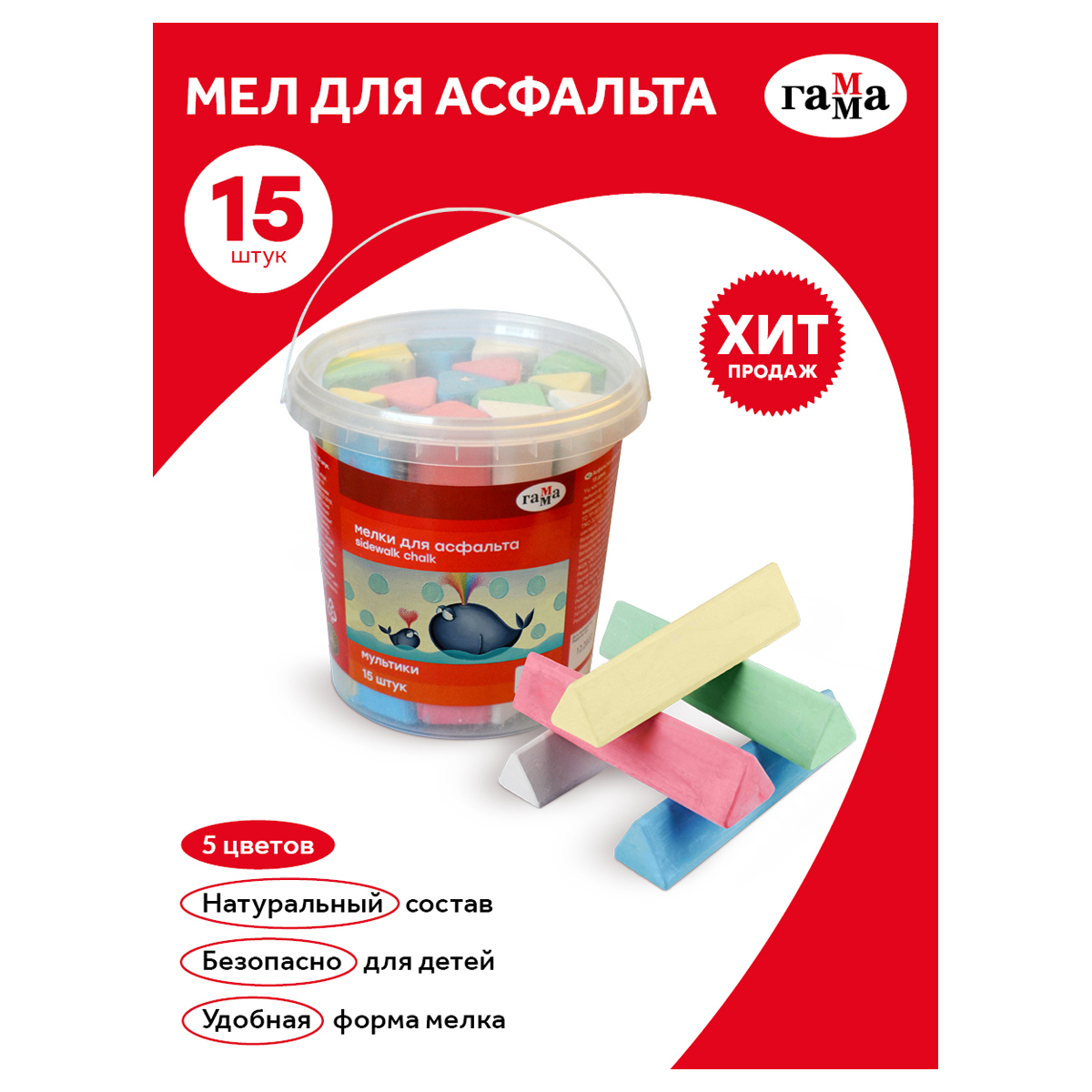 Набор треугольных мелков для рисования на асфальте ГАММА серии «Мультики» подходит для рисования на любой шероховатой поверхности и состоит из 15 мелков в 5 цветах: белый, желтый, зеленый, синий, красный. Длина – 10,5 см, высота – 22 мм.<br/>Удобная форма и мягкое письмо. Натуральный состав на основе мела, гипса, воды и пигментов, без выраженного запаха, средняя твердость. Следы мелков легко счищаются с рук. Набор упакован в пластиковое ведро.<br/>Большие наборы мелков оптимальны для творческого отдыха всей семьей или групповых занятий. Воспитатели и педагоги используют цветные мелки для рисования и подвижных игр на улице.<br/>НЕ РЕКОМЕНДОВАНО ДЛЯ ПИТАНИЯ<br/>• ГАММА — единственный производитель мелков такого размера в России;<br/>• Длина – 10 см, высота – 22 мм.