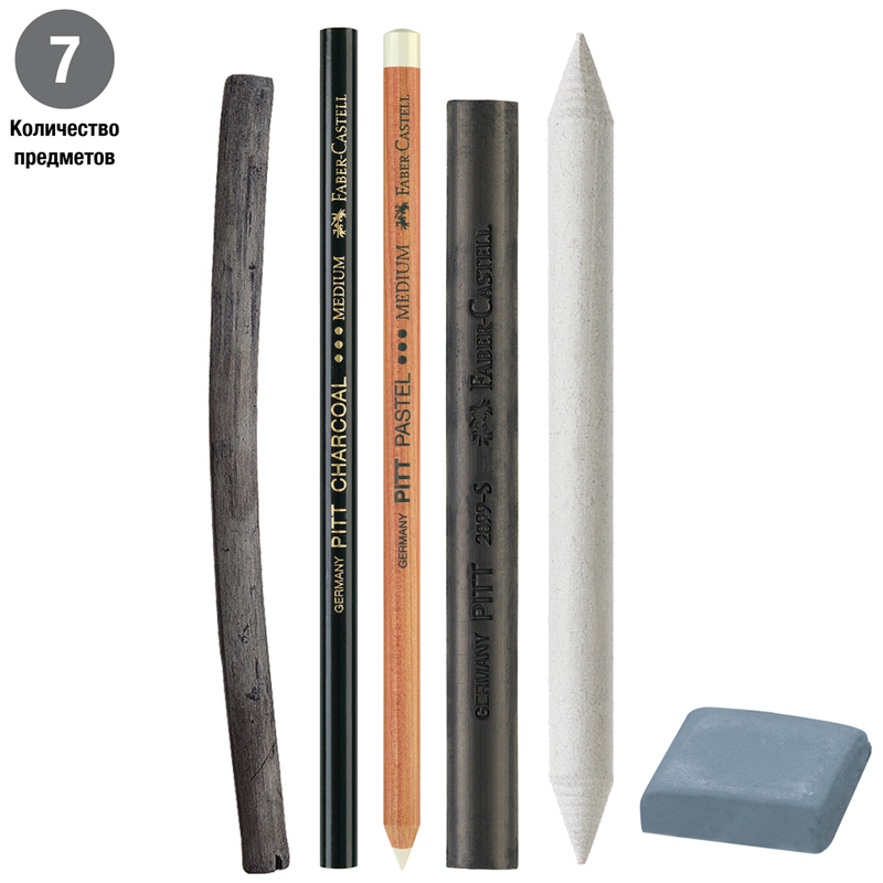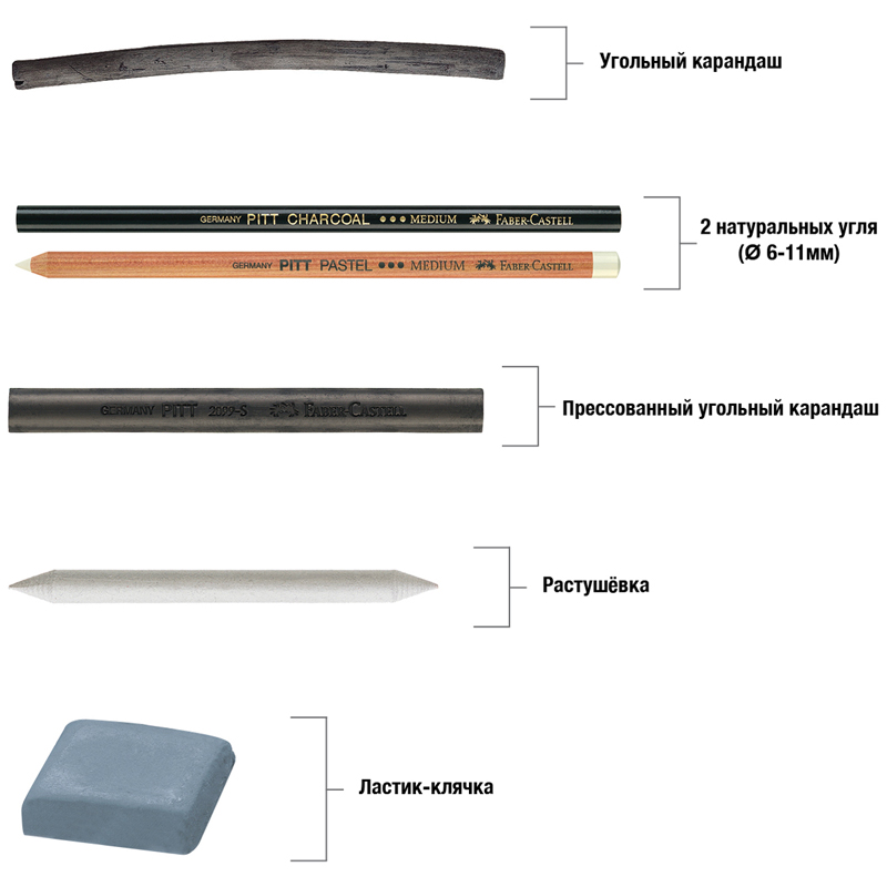 Набор угля и угольных карандашей "Pitt Charcoal". В состав набора входят 2 натуральных угля диаметром 6-11мм, угольный карандаш, прессованный угольный карандаш, растушевка и ластик