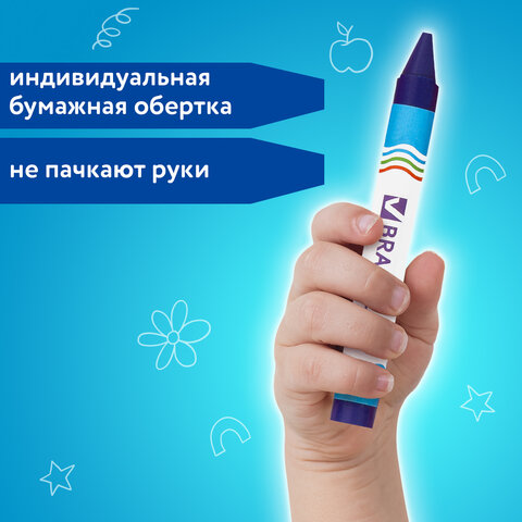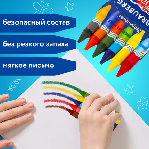Рисование восковыми мелками BRAUBERG способствует развитию мелкой моторики рук, воображения и помогает формировать цветовое восприятие. Идеальны для рисования на бумаге любого типа, а также дереве, картоне и стекле.